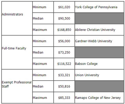 Here, the disclosed compensation is not overly rich. Notably, there is not a dramatic variation in compensation from small to large school within the three professional fields (the largest being the 48% difference in faculty maximums from small to large). This may imply a level paying field in academe absent within, say, the financial services industry. However, it would be risky to use the figures provided by The Chronicle for aspirational purposes. The data here reflects a mere 85 schools among thousands of American institutions. And the information provided to support the results is incomplete: no value is provided for the cost of benefits, and compensation is rendered solely in terms of salary. Total compensation in the field of higher education can include amounts for bonuses, deferred compensation, and other sums. Given the incompleteness of the data, it may be that the best The Chronicle can conclude, in the 30 instances where the compensation and benefits recognition category has been met among 85 schools, is that “Pay is fair, and benefits meet the needs of employees.”